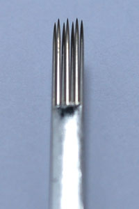 It is important to use professional sterilized tattooing needles for safety and results with either technique. The difference between a normal needle and a tattooing needle is that tattoo needles have multiple tips on the end as detailed in the photo.